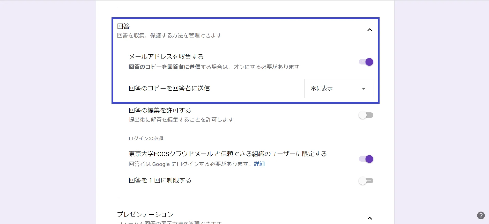 2. 「東京大学ECCSクラウドメールと信頼できる組織のユーザーに限定する」がオンになっていることを確認します.なお「メールアドレスを収集する」を選択しておくと,回答者のECCSメールアドレスが自動的に記録されます.