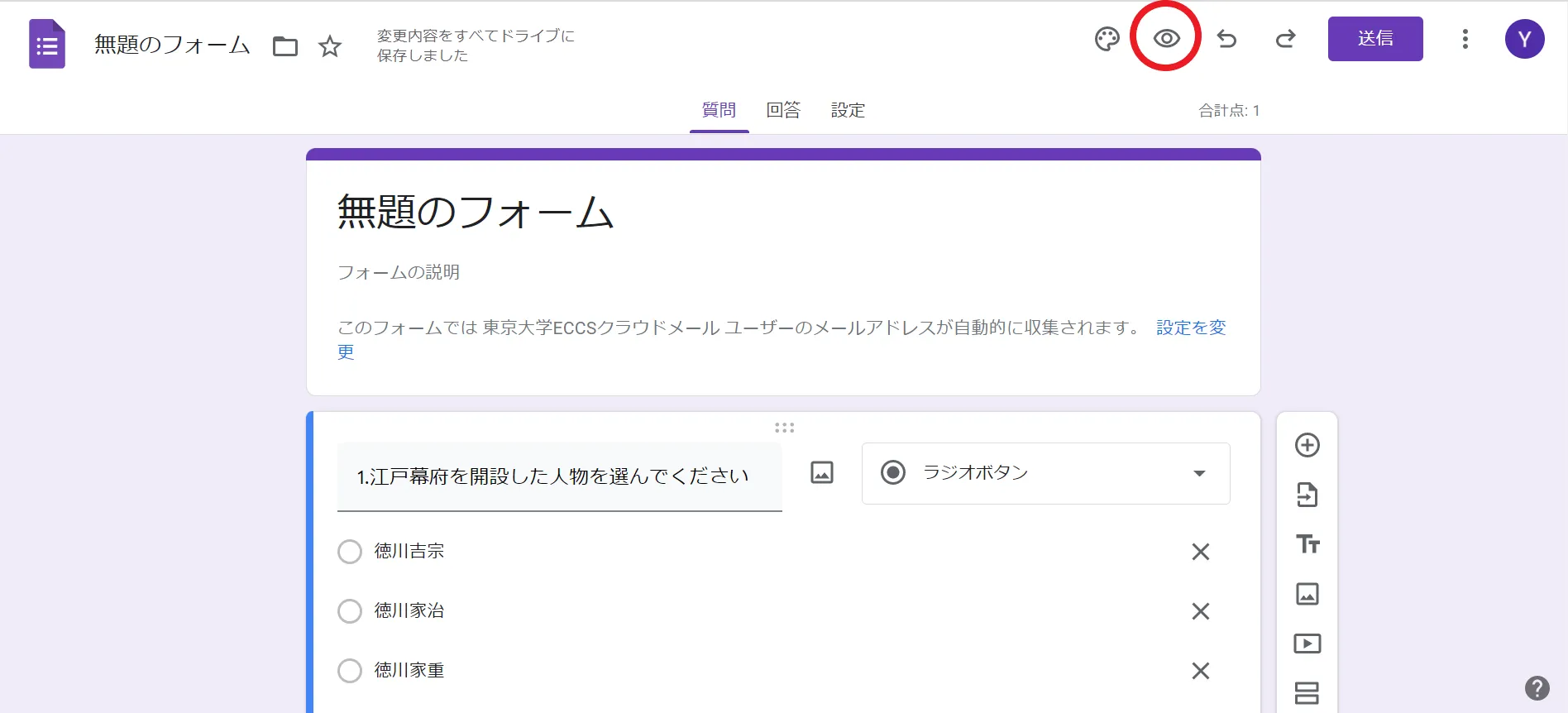 右側の⽬のマークのアイコン(下図赤丸)をクリックして,共有するテストを確認します.