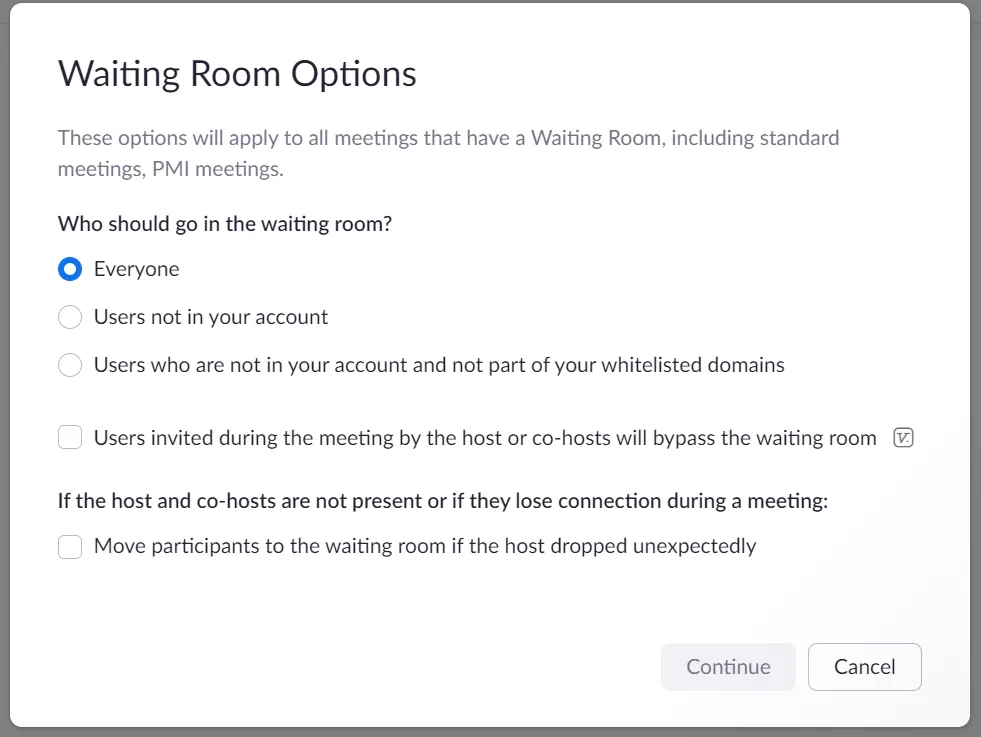 • Method C (Not recommended): Place all participants in the Waiting Room first. Then give each participant the host’s permission to enter the meeting room. This method is useful when the host knows the participants in advance, but not suitable for online classes where the host (instructor) may not know all the students.