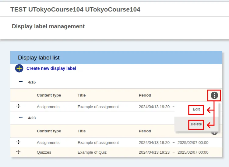 1. The term Course Settings > Display label management, for example, refers to the Display label management option within the Course Settings section, accessible via the left menu (displayed when clicking the three horizontal lines button at the upper left corner of the screen).