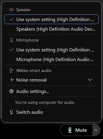 • Speaker : You can select the speaker you want to use (if you have a separate speaker, you will have multiple choices, so select the one you want to use). Click “Test” to hear a confirmation sound.