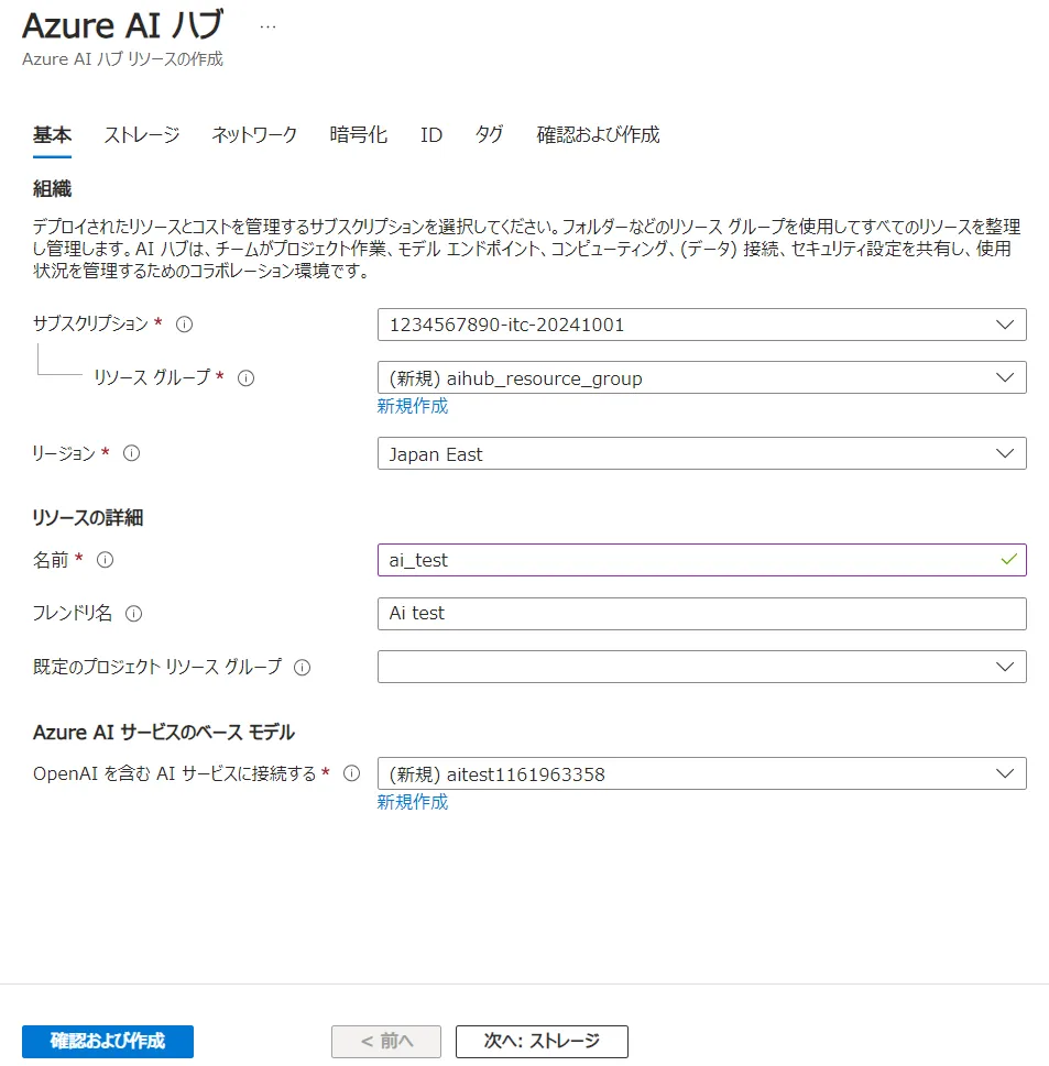 • リソースグループ:ここでは新規にaihub_resource_groupというリソースグループ名で作成し,以下に作成される各リソースをまとめます.まとめられたリソースは,権限の継承や削除などを一括で対応することが可能となります.