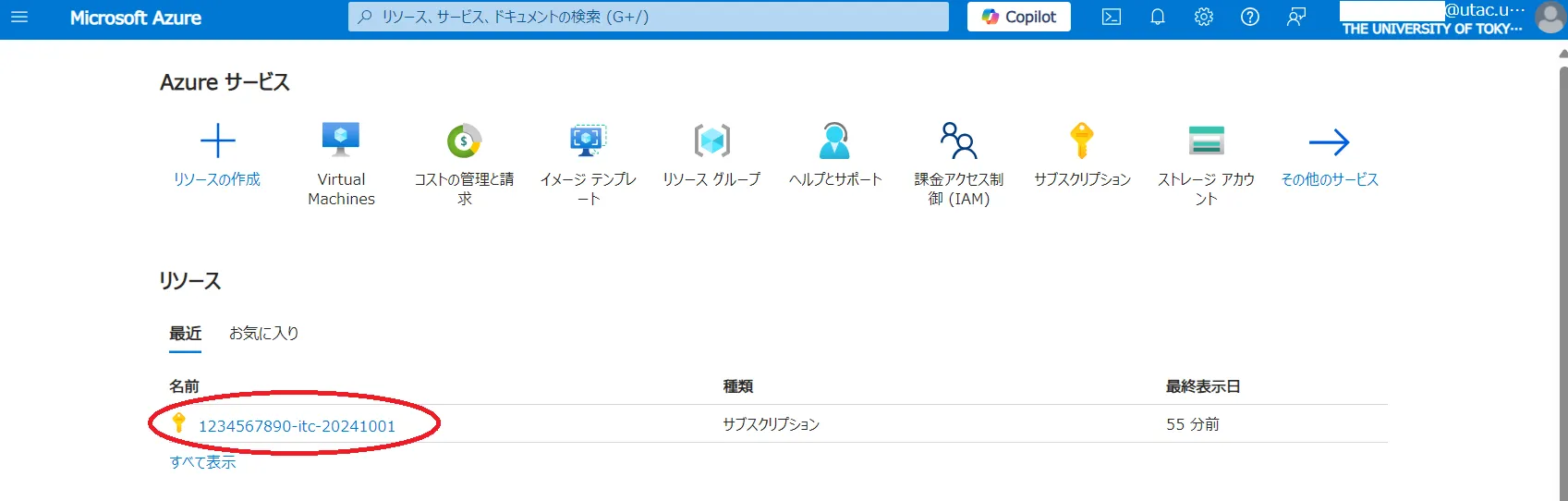 Azure portalUTokyo Accountでログインし、リソースの欄にサブスクリプションがない場合(下図参照),先に以下のURLからサブスクリプションを申請してください.