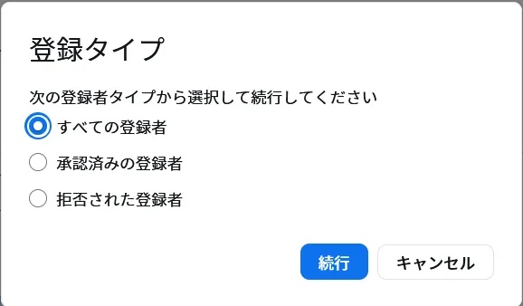 6. 続けて表示される画面で,集計の対象となる参加希望者を選択してください.「すべての登録者」,「承認済みの登録者」,「拒否された登録者」から選択し,「続行」ボタンを押してください.