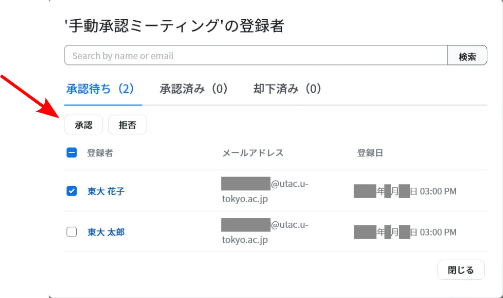 6. 承認したい参加希望者の左にあるチェックボックスをオンにして,「承認」ボタンを押してください.