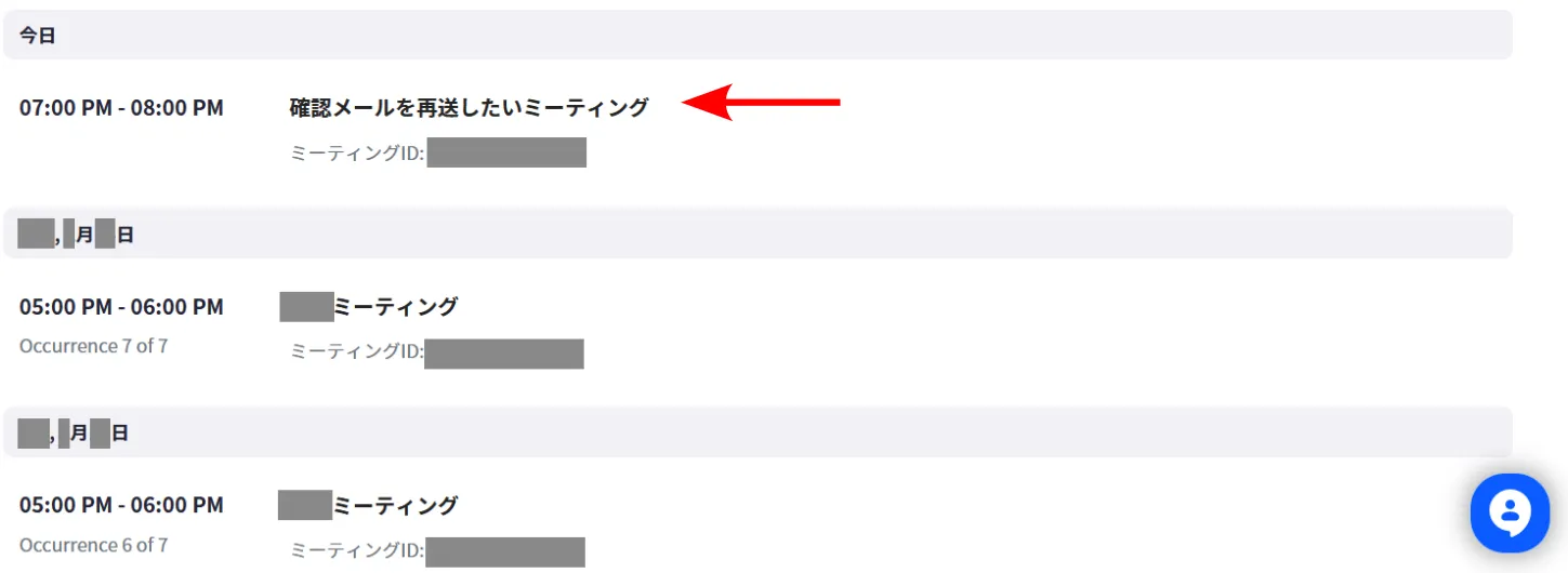 2. 自分のスケジュールしたミーティングが,リストとして表示されます.確認メールを再送したい登録済み参加希望者が登録したミーティングの名前を押してください.